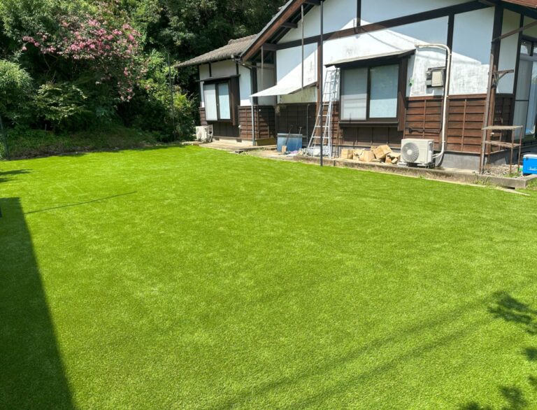 お庭全体の雑草処理後、砂を追加して整地・転圧後、防草シートと人工芝を施工致しました。緑鮮やかになったお庭に「見違えるほど綺麗になった!」と大変お喜びいただけました。またAタイプ芝丈30mmのクッション性にもご満足いただけました。この度は誠にありがとうございました。